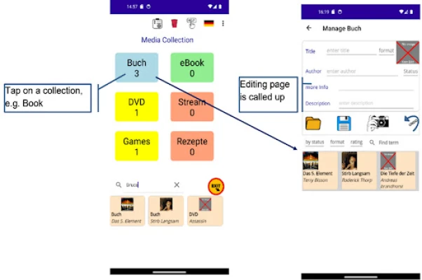 Verwalte mühelos all deine Sammlungen wie Streaming, Rezepte, Bücher und Spiele mit "Sammlungen / Medien verwalten". Erfasse bis zu 8 Kategorien, füge Einträge mit Bildern und Text hinzu. Nutze die Volltextsuche, Statusverwaltung und persönliche Sterne-Bewertungen, um den Überblick zu behalten. Organisiere deine Medien effizient an einem Ort.